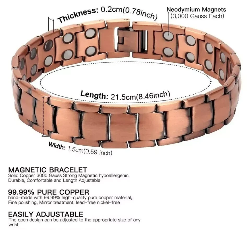 Crafted from pure solid copper, this magnetic therapy bracelet is designed to support joint comfort and everyday wellness while offering a clean, classic look suitable for daily wear.
