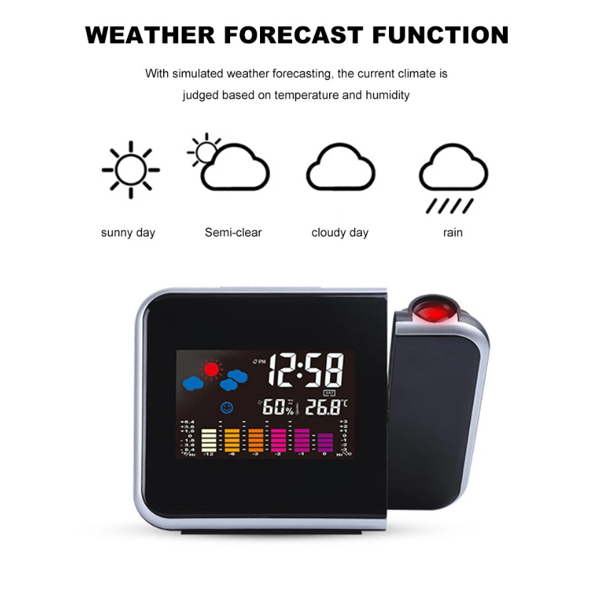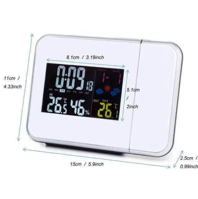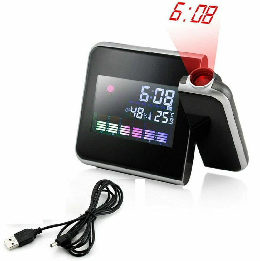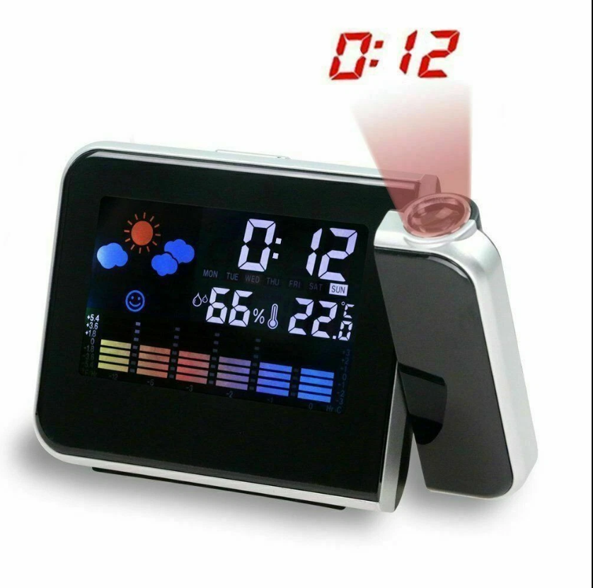 This Projection Alarm Clock with Weather Station is designed to give you clear time visibility along with essential indoor climate information. It combines a modern digital clock with temperature and humidity monitoring, making it a practical addition to any bedroom, office, or living space.